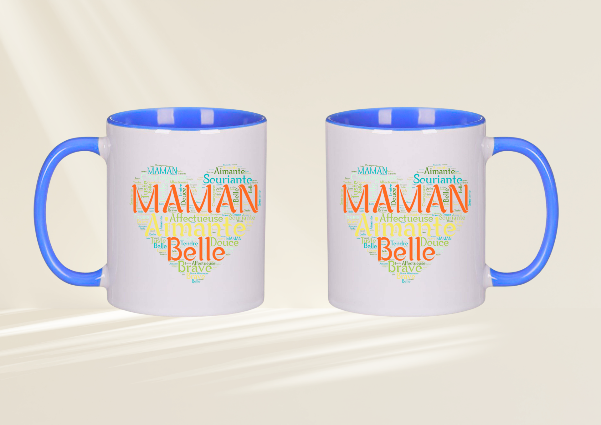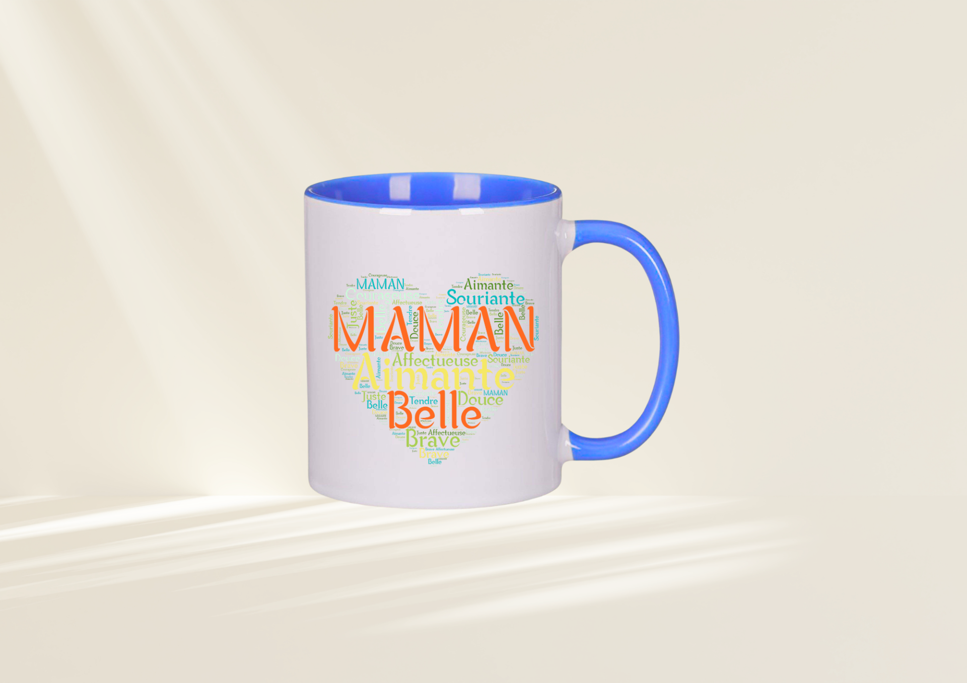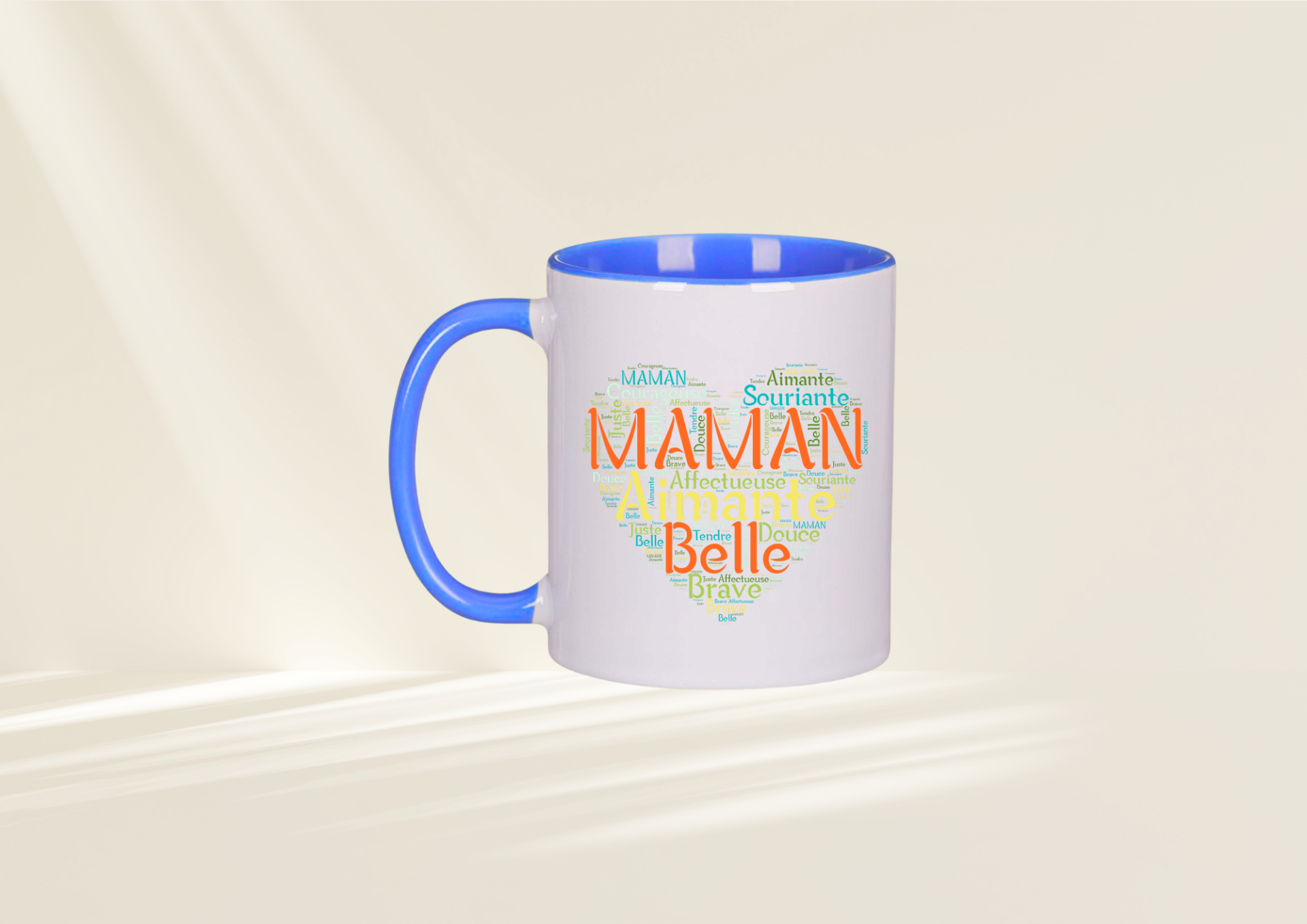 Son visuel élégant met en avant le mot MAMAN au centre d’un cœur composé de qualificatifs tendres : aimante, douce, belle, courageuse, souriante. Un véritable concentré d’amour qui accompagnera chaque pause café ou thé.