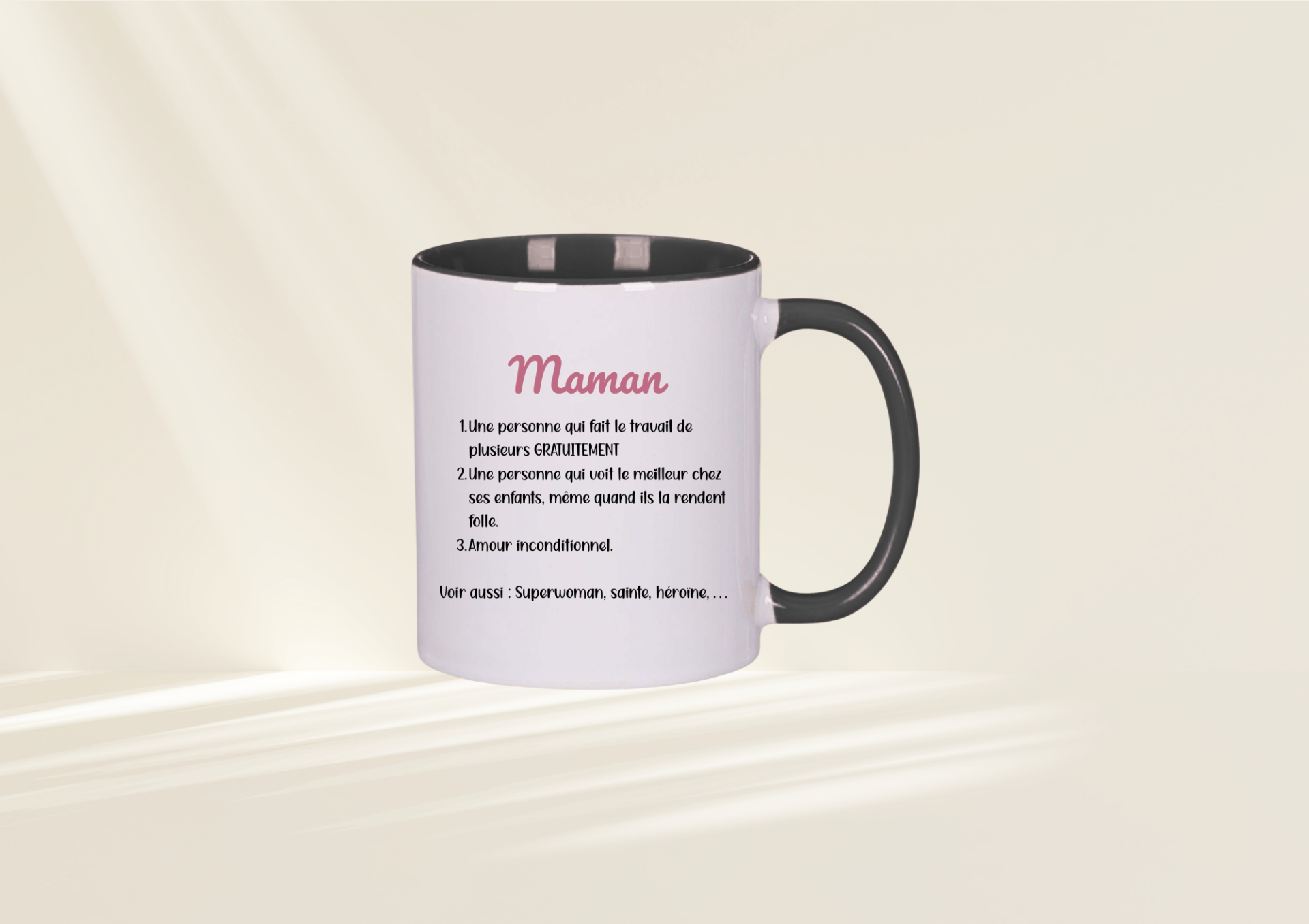 À l'arrière : Une "définition" de Maman pleine d'humour et de tendresse qui décrit parfaitement son rôle de Superwoman (travail multi-tâches, amour inconditionnel et patience infinie).
