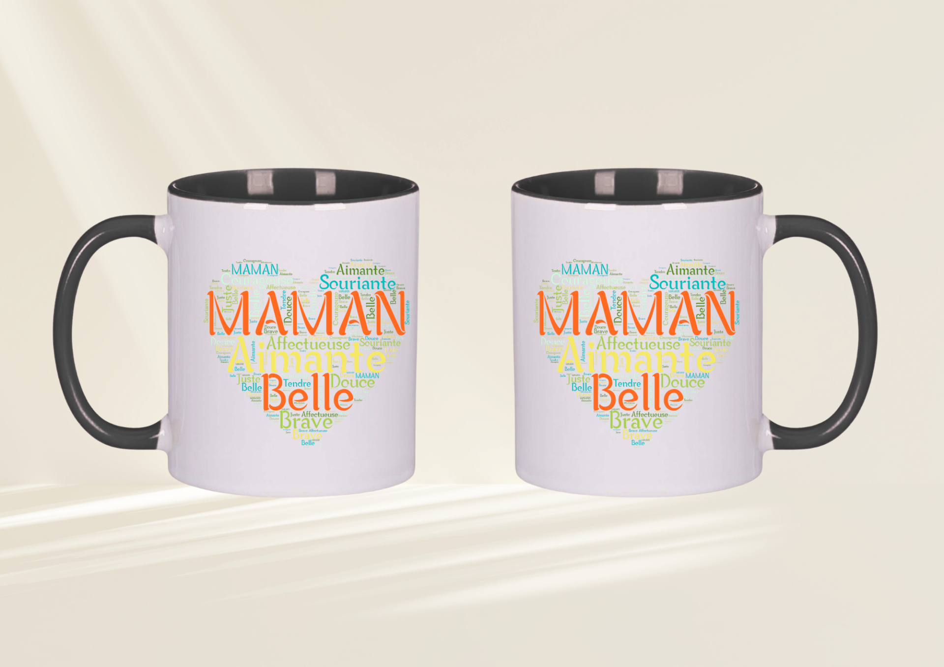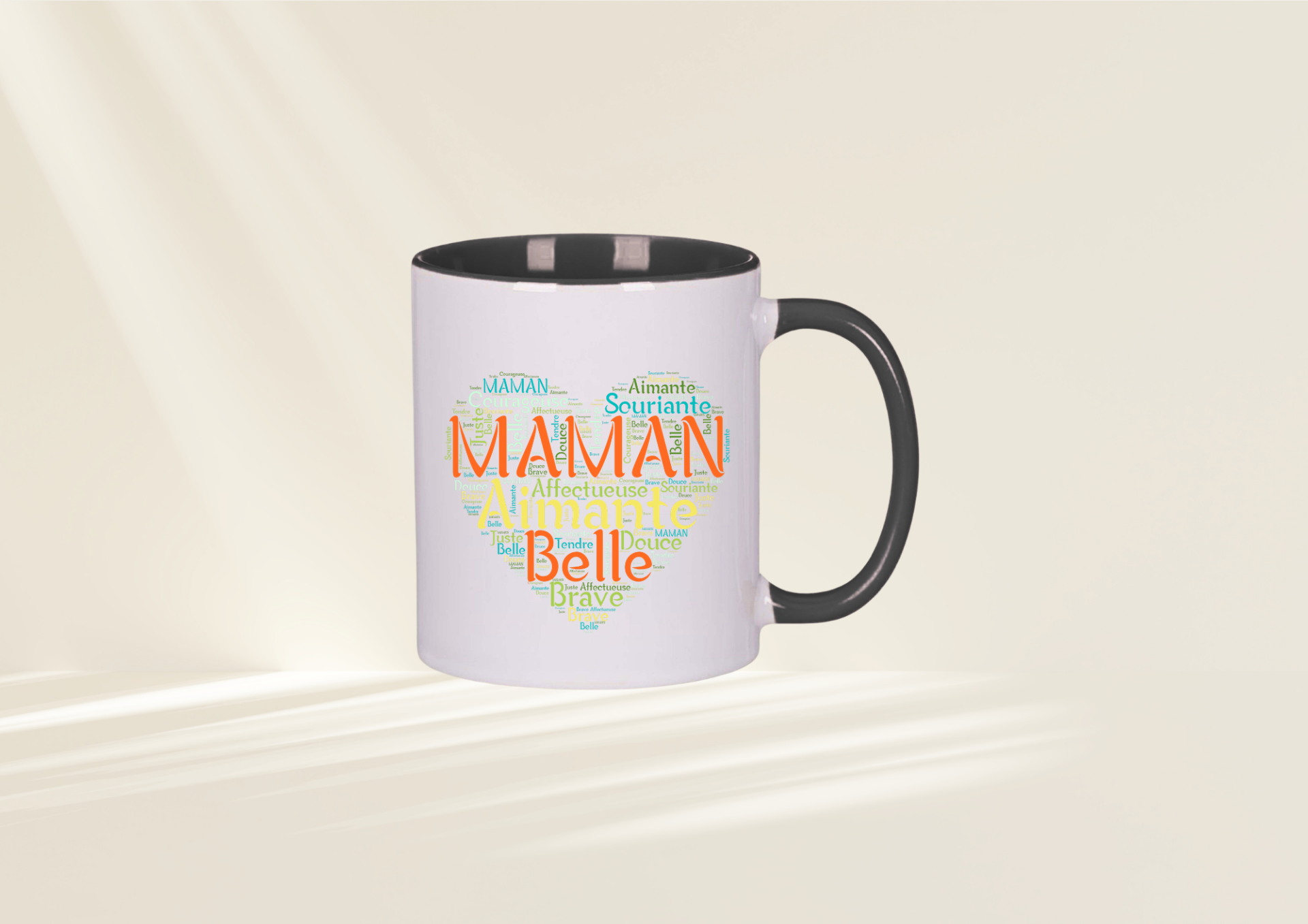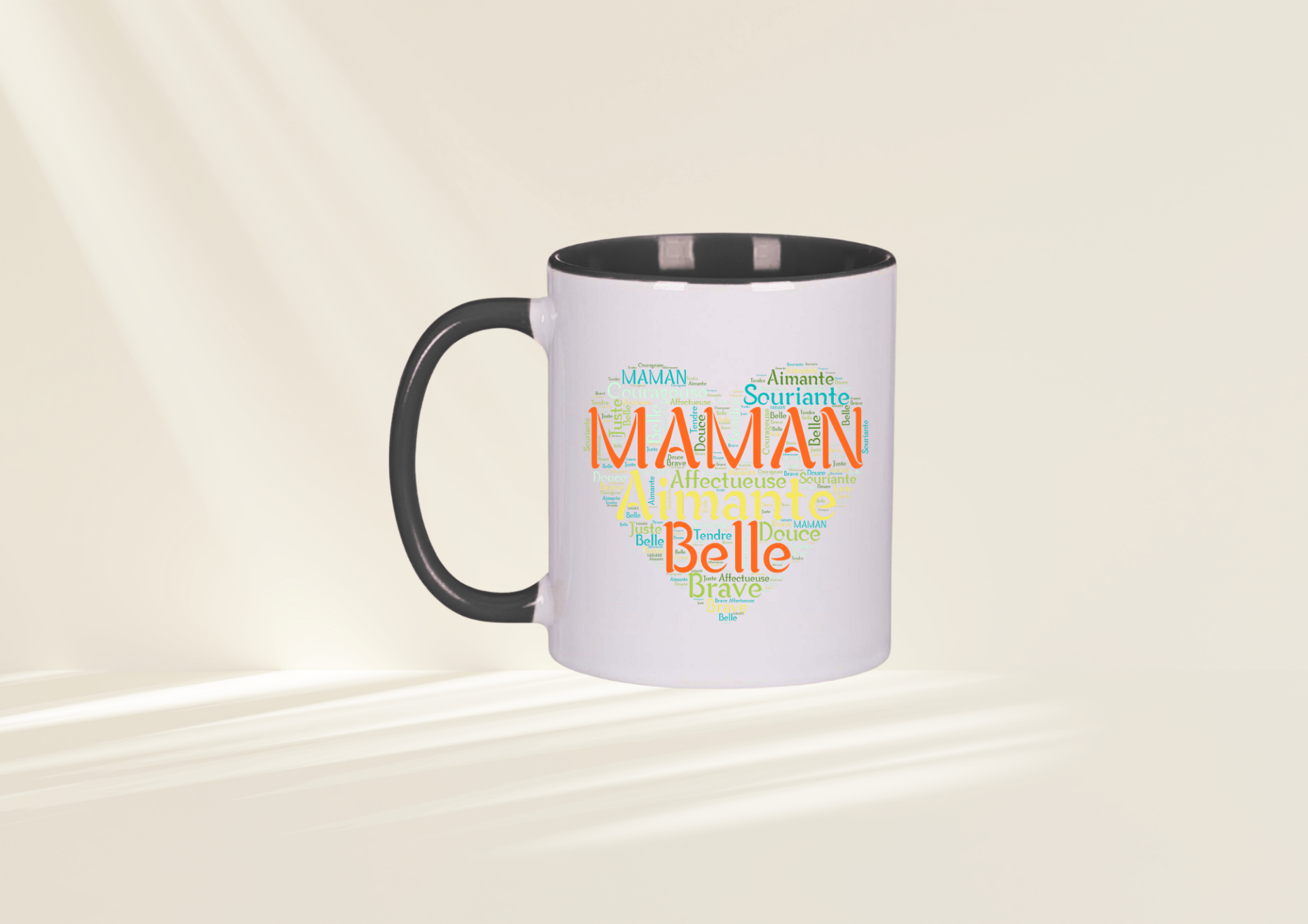 Son visuel élégant met en avant le mot MAMAN au centre d’un cœur composé de qualificatifs tendres : aimante, douce, belle, courageuse, souriante. Un véritable concentré d’amour qui accompagnera chaque pause café ou thé.